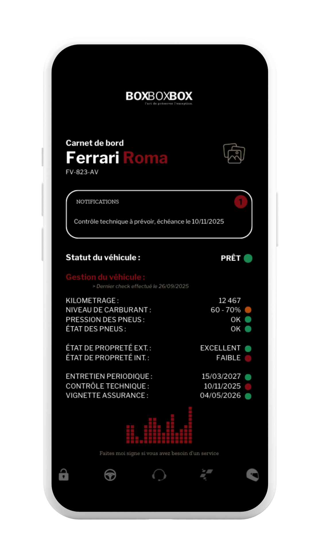 Chaque véhicule dispose d’un suivi complet et actualisé, accessible depuis votre espace BOXBOXBOX.